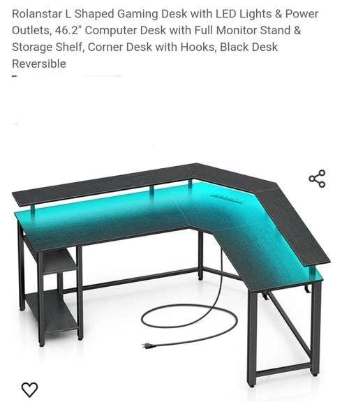 Rolanstar L Shaped Gaming Desk with LED Lights & Power Outlets, 46.2" Computer Desk with Full Monitor Stand & Storage Shelf, Corner Desk with Hooks, Black Desk Reversible