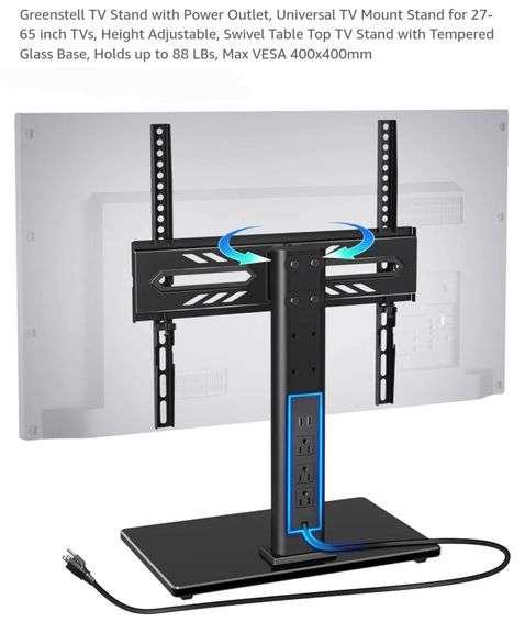 Greenstell TV Stand with Power Outlet, Universal TV Mount Stand for 27-65 inch TVs, Height Adjustable, Swivel Table Top TV Stand with Tempered Glass Base, Holds up to 88 LBs, Max VESA 400x400mm