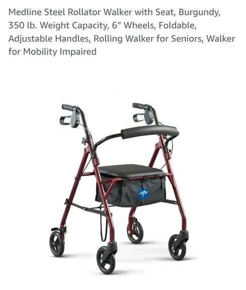 Medline Steel Rollator Walker with Seat, Burgundy, 350 lb. Weight Capacity, 6” Wheels, Foldable, Adjustable Handles, Rolling Walker for Seniors, Walker for Mobility Impaired