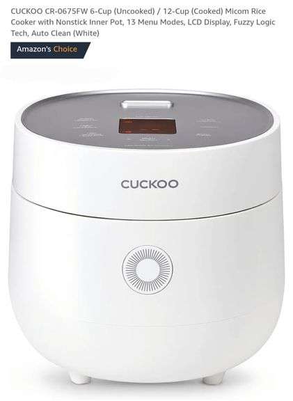 CUCKOO CR-0675FW 6-Cup (Uncooked) / 12-Cup (Cooked) Micom Rice Cooker with Nonstick Inner Pot, 13 Menu Modes, LCD Display, Fuzzy Logic Tech, Auto Clean (White)