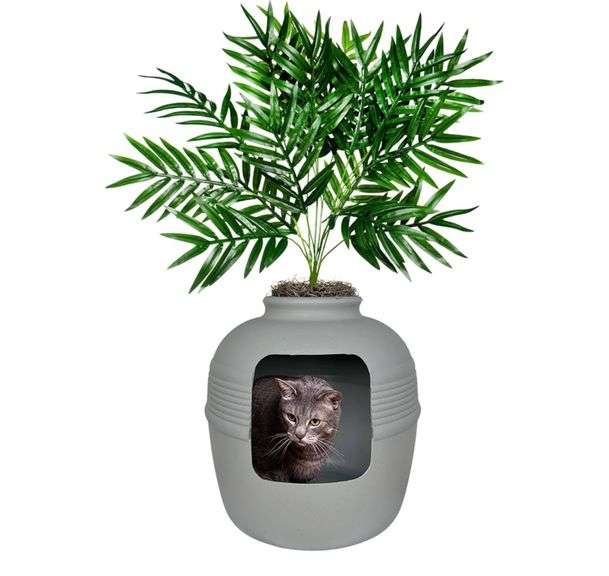 Good Pet Stuff Hidden Litter Box Base Kit, Round Enclosed Cat Planter Furniture with Fake Plant, Hooded Vented Carbon Filter System for Odor Control, Easy to Clean, Made in USA, Stone Grey