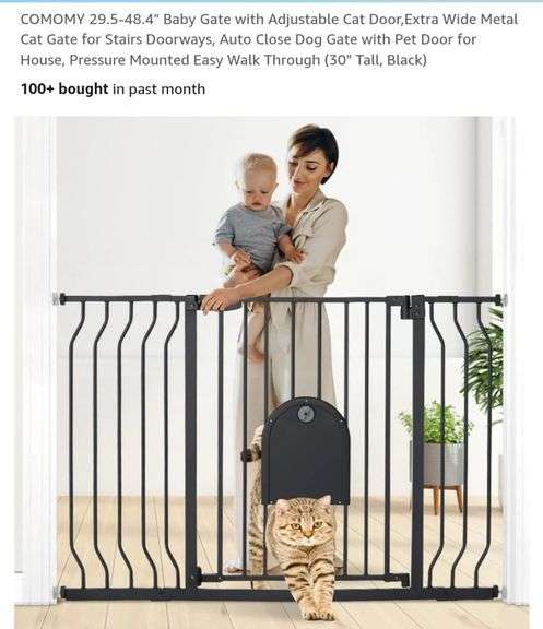 COMOMY 29.5-48.4" Baby Gate with Adjustable Cat Door,Extra Wide Metal Cat Gate for Stairs Doorways, Auto Close Dog Gate with Pet Door for House, Pressure Mounted Easy Walk Through (30" Tall, Black)