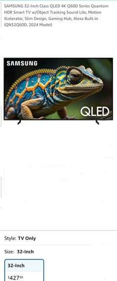 SAMSUNG 32-Inch Class QLED 4K Q60D Series Quantum HDR Smart TV w/Object Tracking Sound Lite, Motion Xcelerator, Slim Design, Gaming Hub, Alexa Built-in (QN32Q60D, 2024 Model)