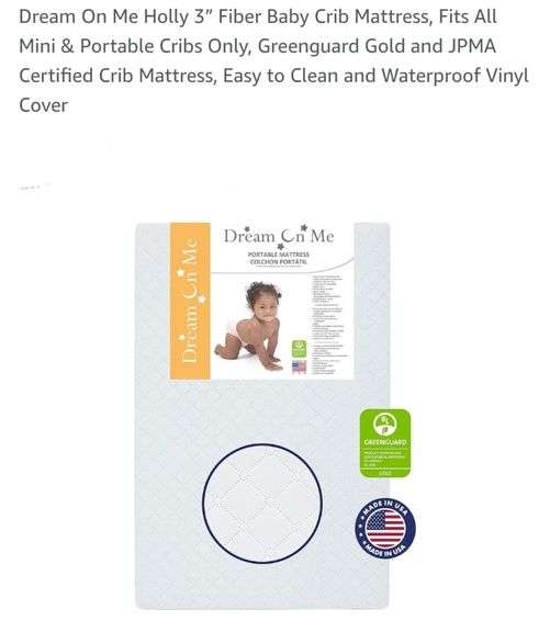 LOT 35BR - Dream On Me Holly 3” Fiber Baby Crib Mattress, Fits All Mini & Portable Cribs Only, Greenguard Gold and JPMA Certified Crib Mattress, Easy to Clean and Waterproof Vinyl Cover