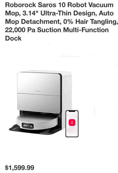 Roborock Saros 10 Robot Vacuum Mop, 3.14" Ultra-Thin Design, Auto Mop Detachment, 0% Hair Tangling, 22,000 Pa Suction Multi-Function Dock