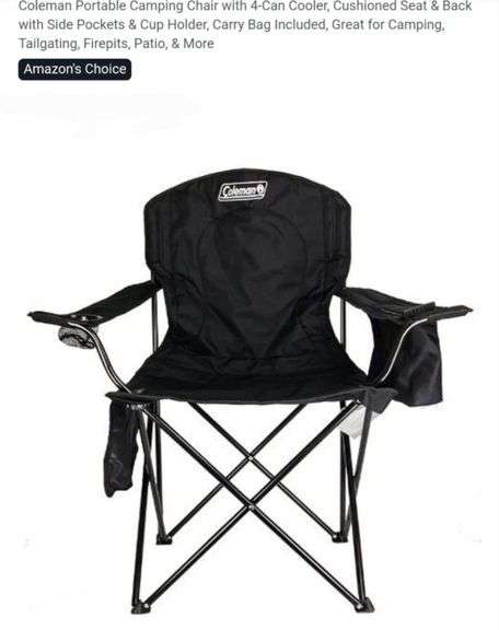 LOT 23y - Coleman Portable Camping Chair with 4-Can Cooler, Cushioned Seat & Back with Side Pockets & Cup Holder, Carry Bag Included, Great for Camping, Tailgating, Firepits, Patio, & More