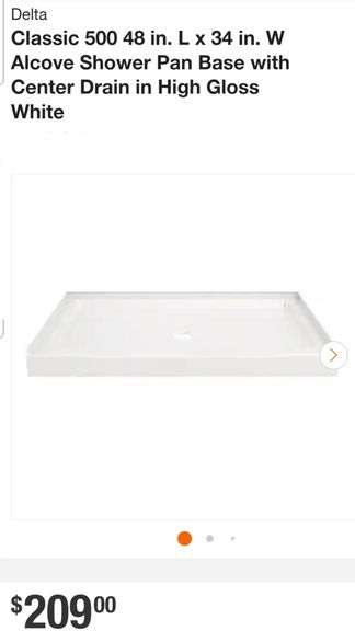 LOT 13y - Delta Classic 500 48 in. L x 34 in. W Alcove Shower Pan Base with Center Drain in High Gloss White