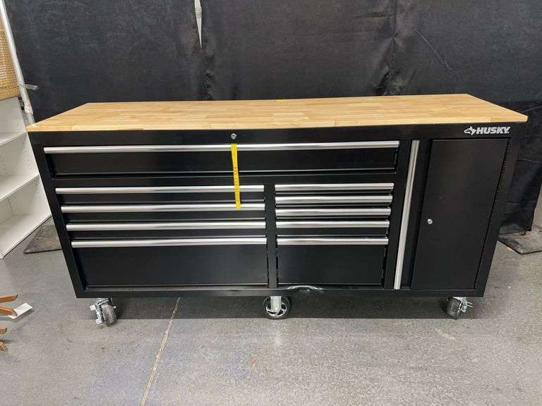 READ! Husky Standard Duty 72 in. W x 20 in. D 10-Drawer Black Mobile Workbench Cabinet with Solid Wood Top