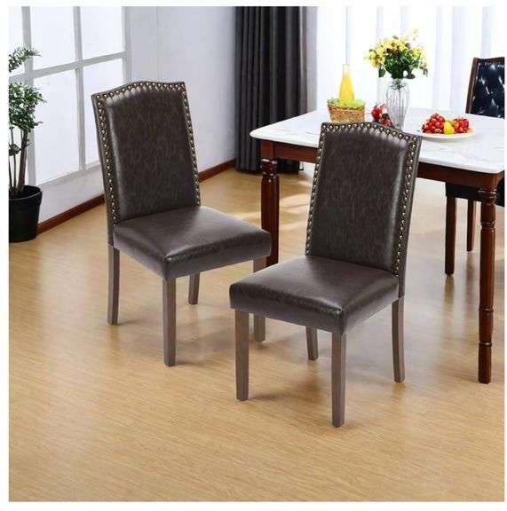 Modern Dining Chair Set of 2, Stylish Kitchen Chair with Wood Legs, Dining Room Chair with Upholstered Fabric and Nailhead Trim for Elegant Home Decor, Dark Brown Leather-40"D x 12"W x 18"H inches