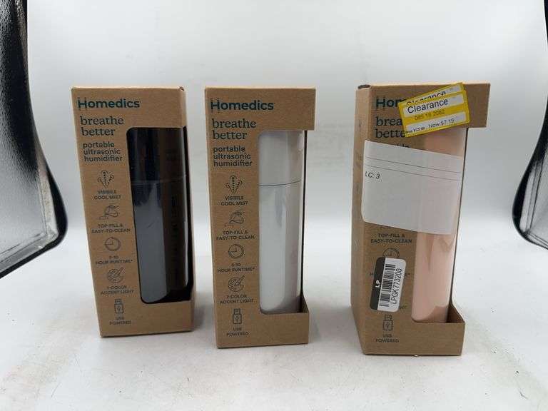 (3) HoMedics Portable Ultrasonic Humidifier, black, white, peach