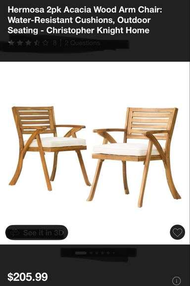 LOT 30y - Hermosa 2pk Acacia Wood Arm Chair: Water-Resistant Cushions, Outdoor Seating - Christopher Knight Home