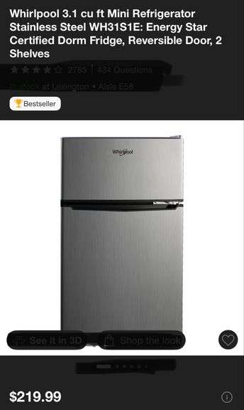 Whirlpool 3.1 cu ft Mini Refrigerator Stainless Steel WH31S1E: Energy Star Certified Dorm Fridge, Reversible Door, 2 Shelves