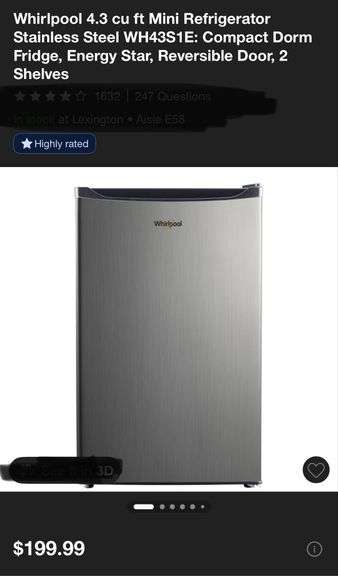 Whirlpool 4.3 cu ft Mini Refrigerator Stainless Steel WH43S1E: Compact Dorm Fridge, Energy Star, Reversible Door, 2 Shelves