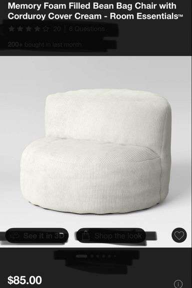 LOT 584 - Memory Foam Filled Bean Bag Chair with Corduroy Cover Cream - Room Essentials™