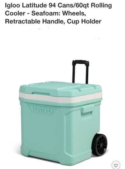 READ!! Igloo Latitude 94 Cans/60qt Rolling Cooler - Seafoam: Wheels, Retractable Handle, Cup Holder