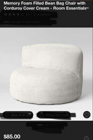 LOT 622 - Memory Foam Filled Bean Bag Chair with Corduroy Cover Cream - Room Essentials™