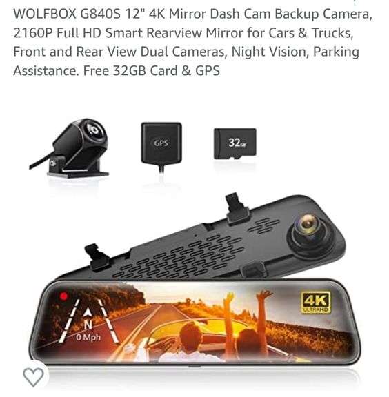 WOLFBOX G840S 12" 4K Mirror Dash Cam Backup Camera, 2160P Full HD Smart Rearview Mirror for Cars & Trucks, Front and Rear View Dual Cameras, Night Vision, Parking Assistance, Free 32GB Card & GPS