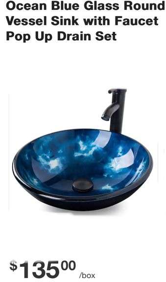 LOT 72 - Ocean Blue Glass Round Vessel Sink with Faucet Pop Up Drain Set