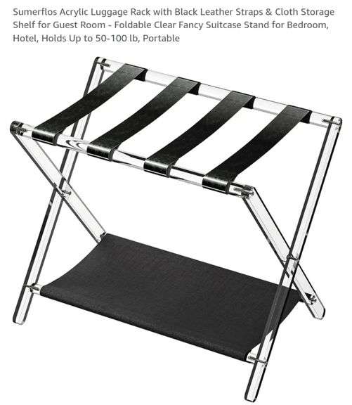Sumerflos Acrylic Luggage Rack with Black Leather Straps & Cloth Storage Shelf for Guest Room - Foldable Clear Fancy Suitcase Stand for Bedroom, Hotel, Holds Up to 50-100 lb, Portable